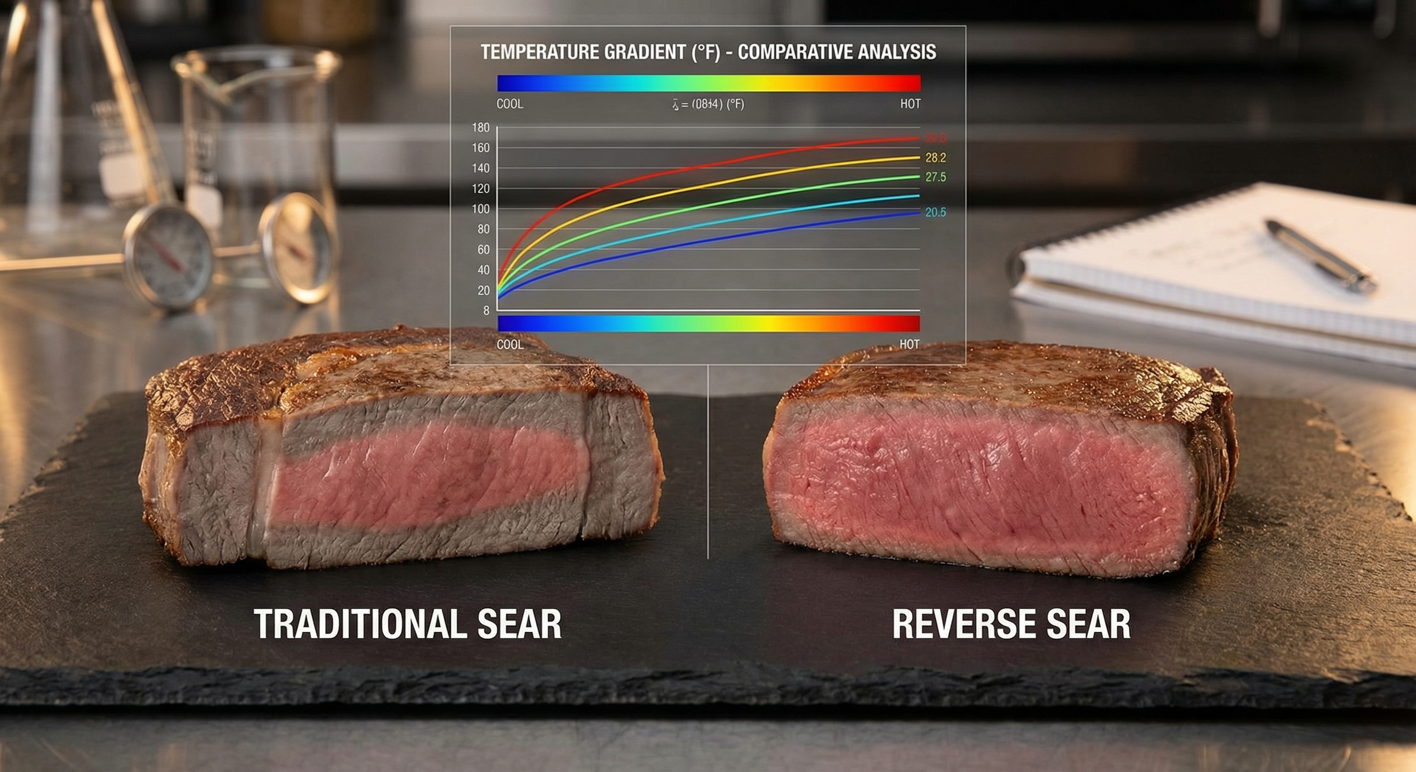 I've spent twelve years measuring temperature gradients in steaks using calibrated thermocouples placed at precise depths. When home cooks ask me "reverse sear or traditional sear?" — I don't give them an opinion. I give them data.