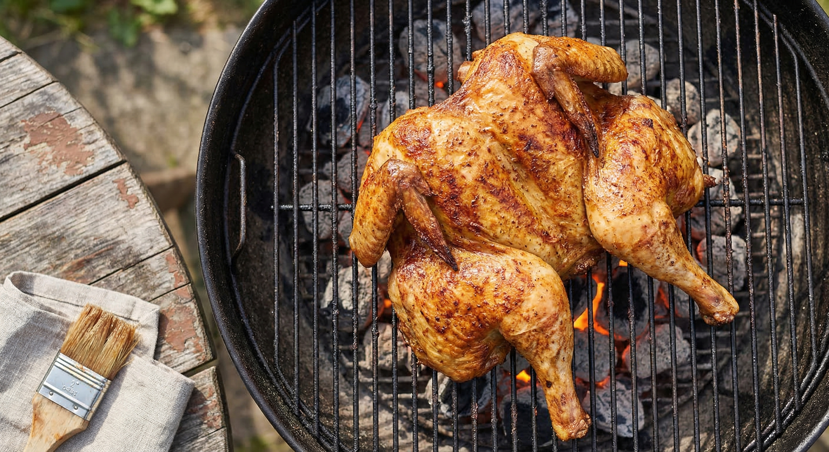 It’s tempting to put the whole bird over the hot coals for faster cooking, but chicken has too much fat for that. The rendered fat drips onto the coals, causing flare-ups that char the skin black before the interior is cooked. Use indirect heat for the bulk of the cook, direct heat only for the final sear.